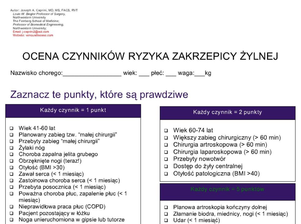 Jak się ryzyko ocenia ryzyko zakrzepicy? Przed zabiegiem obowiązkowo wypełniana jest ankieta Capriniego; wg zebranych punktów “karnych” następuje wybór postępowania.