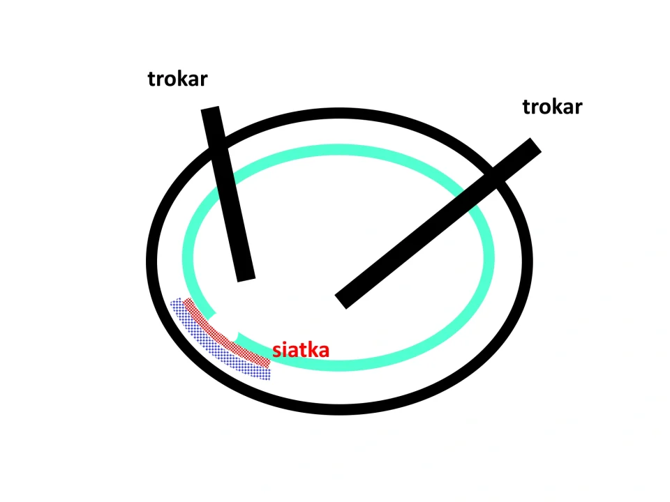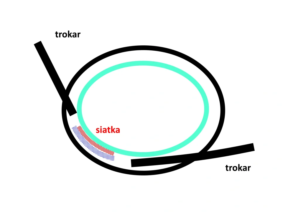 wejście trokarami do przestrzeni przedotrzewnowej (nie do wnętrza jamy brzusznej), wzmocnienie pachwiny od tyłu