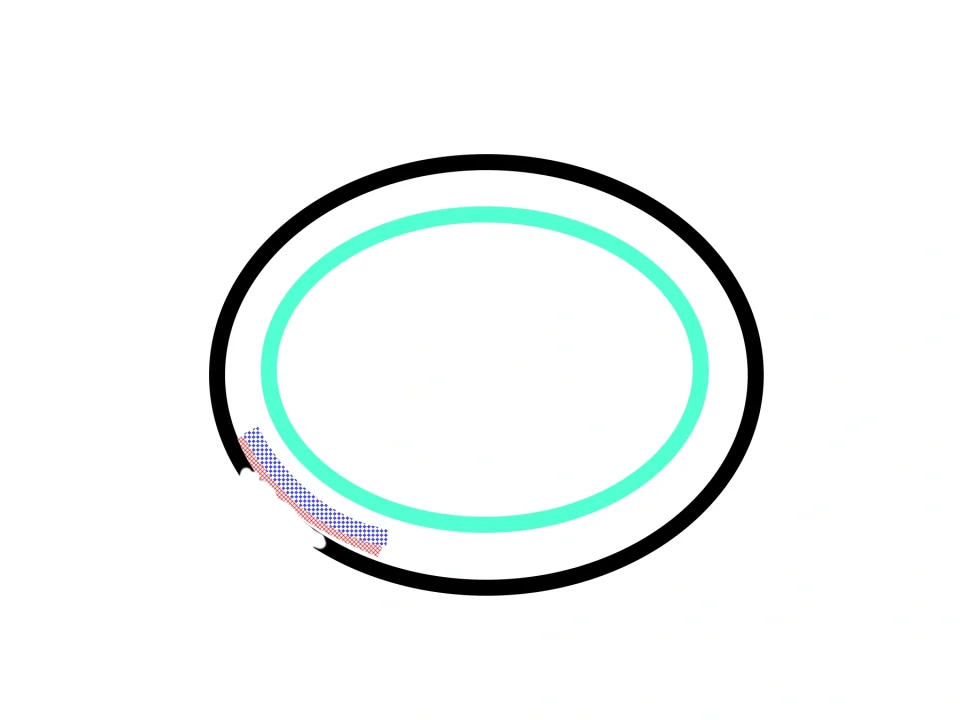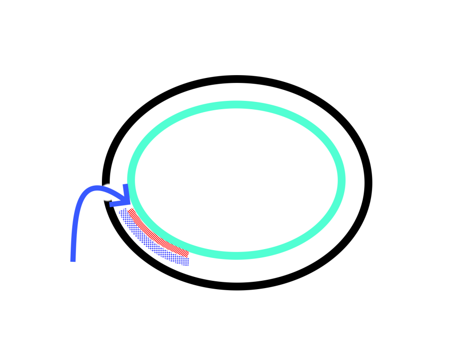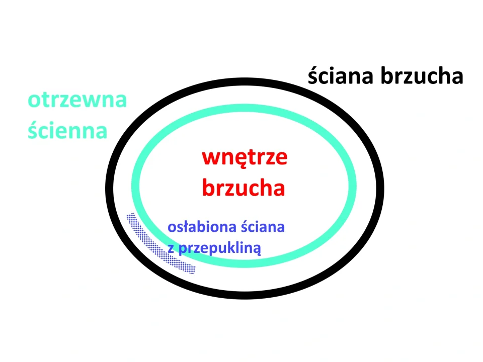 Bardzo schematyczny przekrój jamy brzusznej; trzewia (narządy jamy brzusznej) oddzielone są od ściany brzucha przez błonę - otrzewną ścienną. Siatki wzmocaniające układa się od przodu lub tyłu osłabionej ściany. Dlaczego?